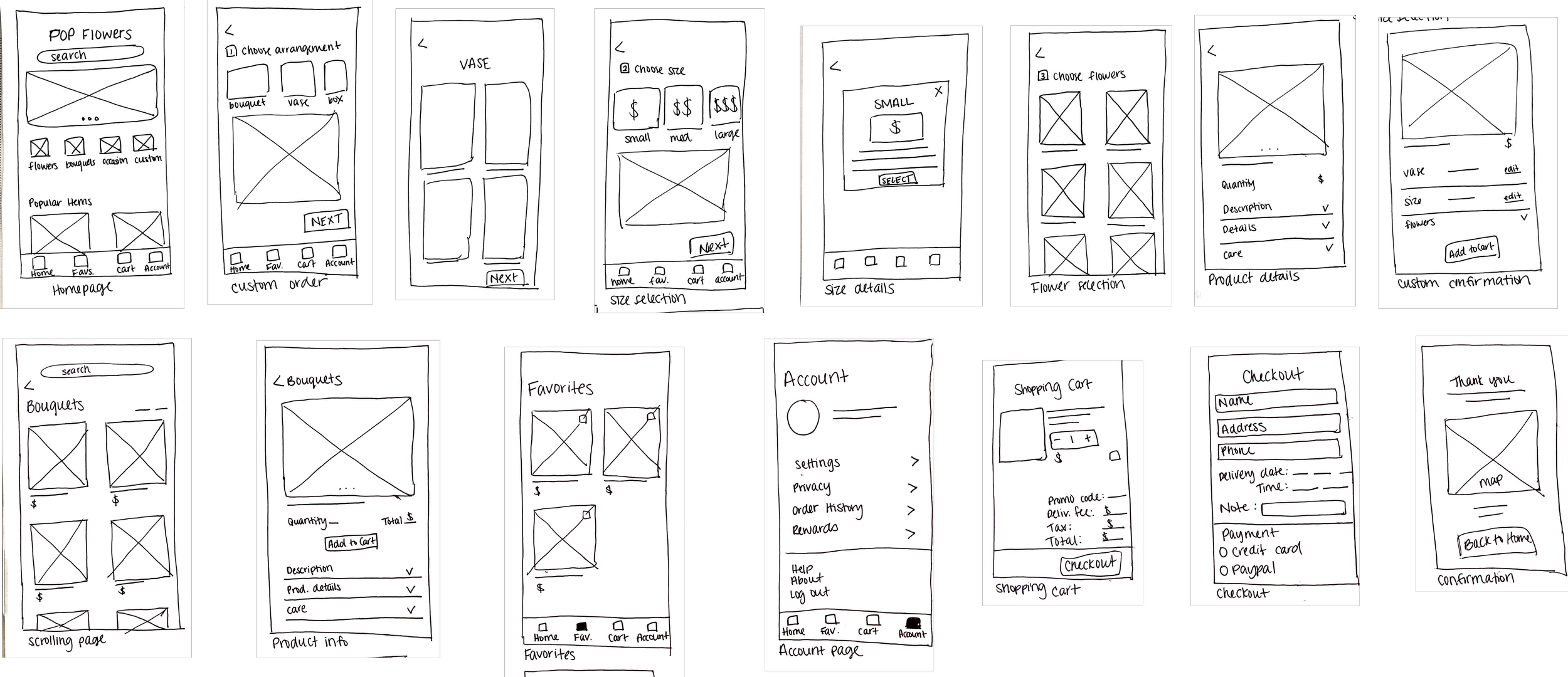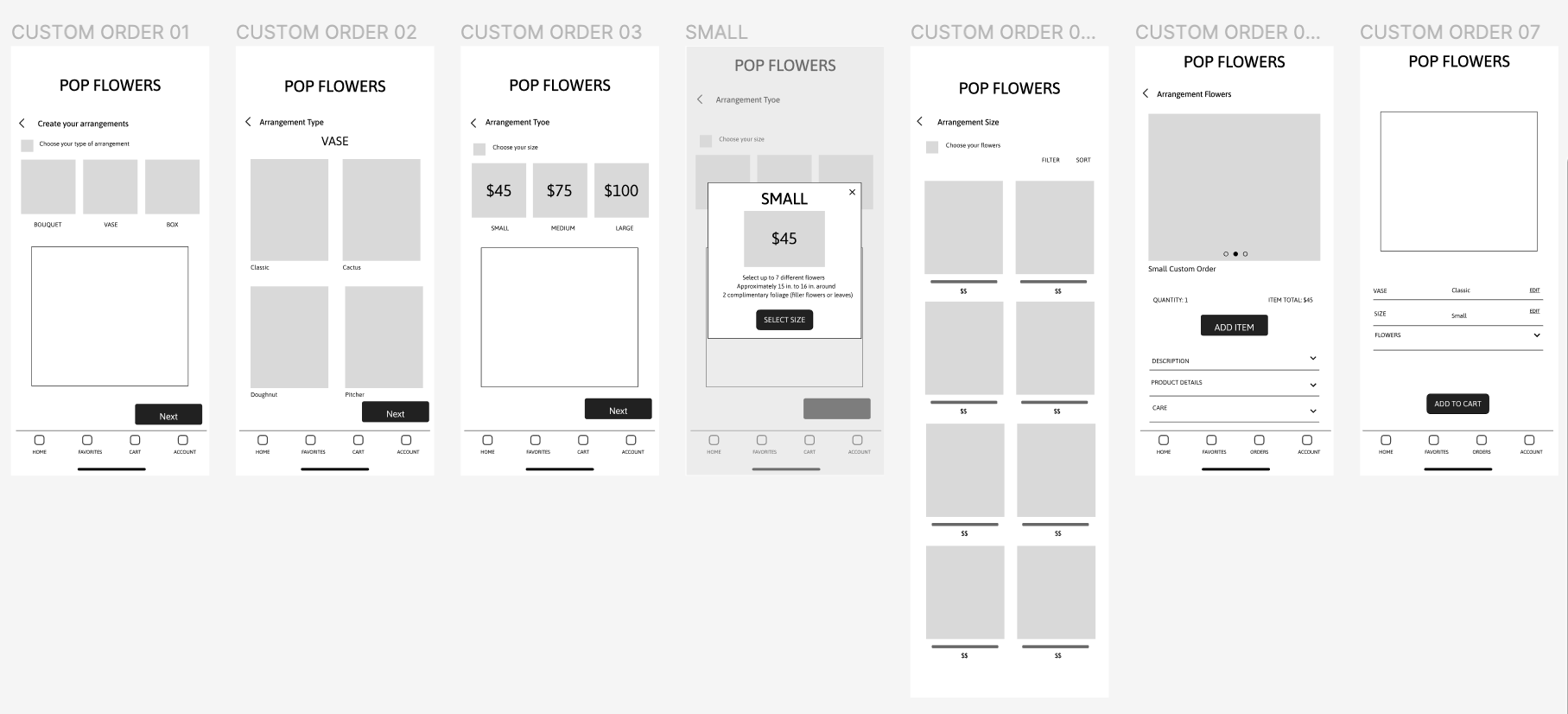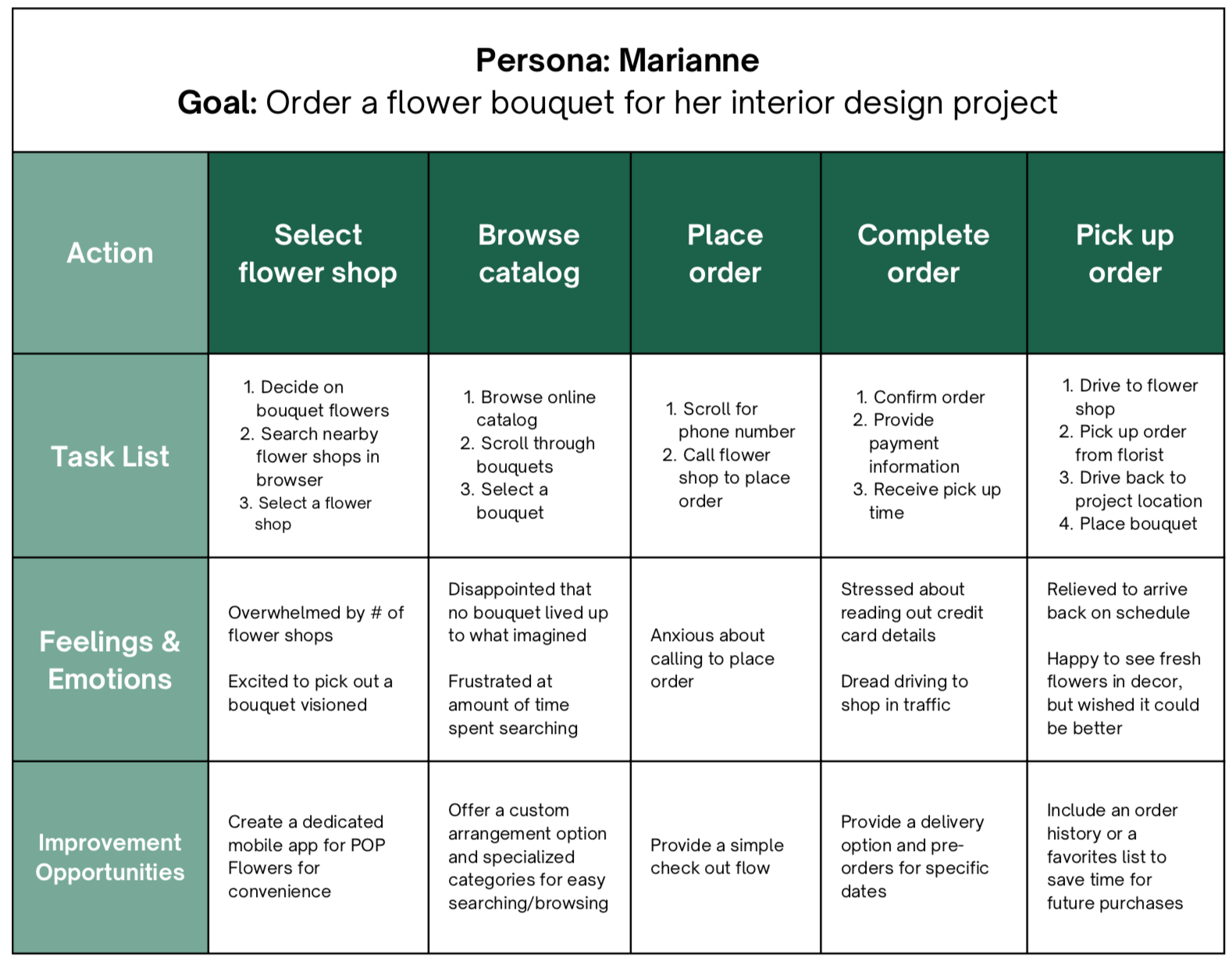I mapped out Marianne’s user flow to evaluate her experience when ordering flowers for her projects. The journey map revealed that a dedicated mobile app would provide the opportunity to create an easier ordering process, a simple checkout flow, and a delivery method.