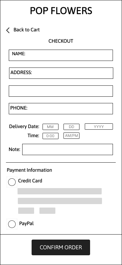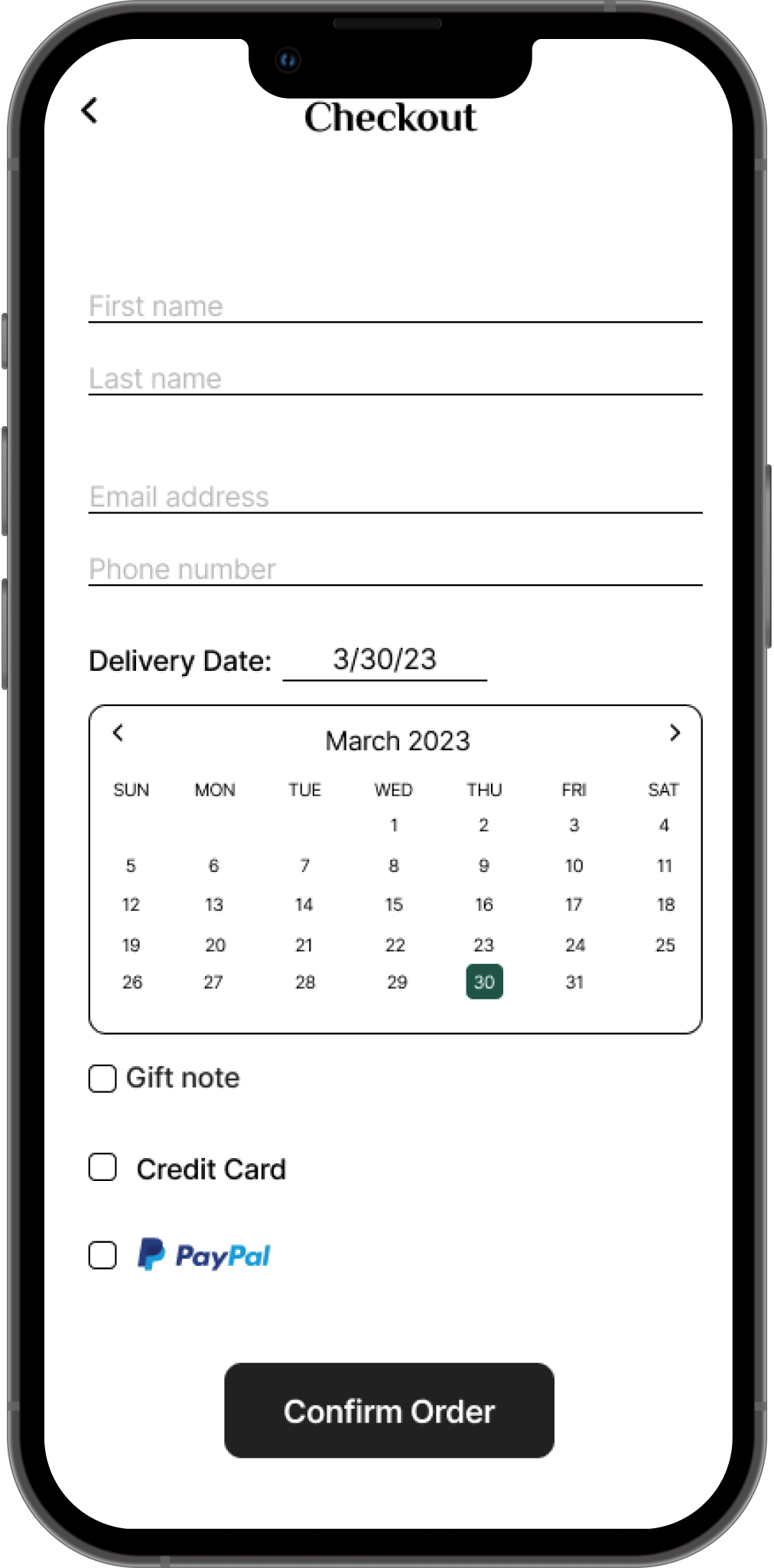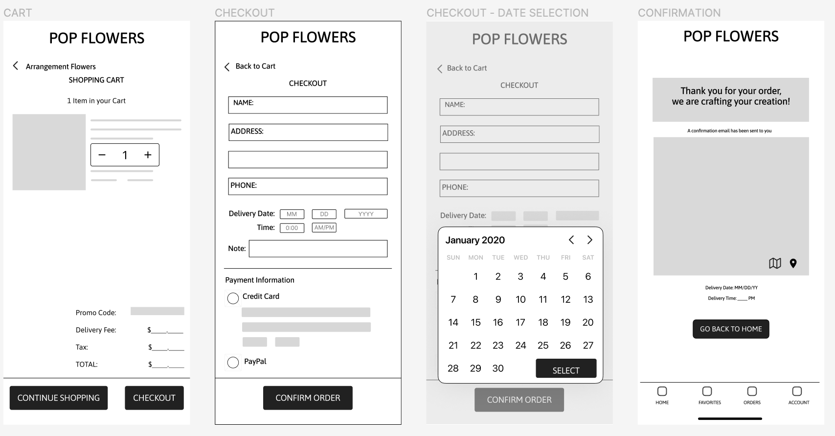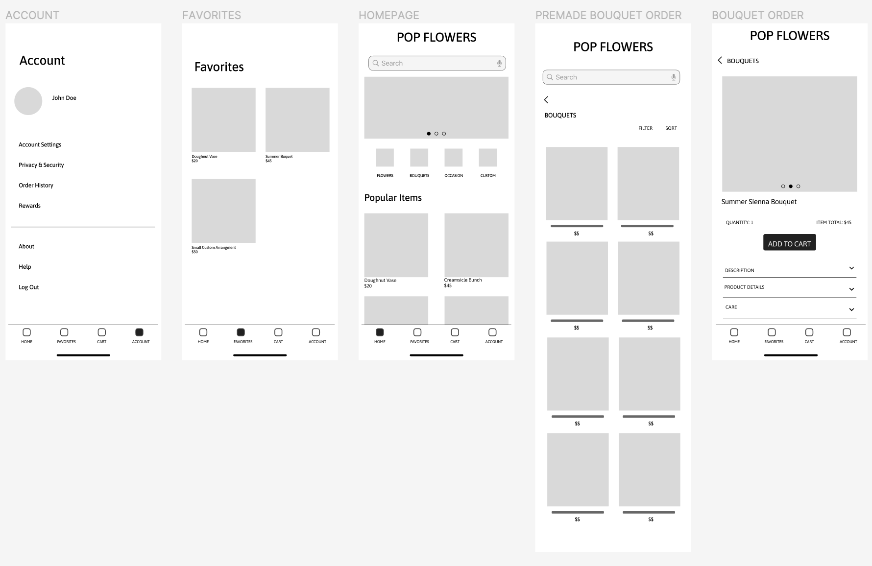 I mapped out Marianne’s user flow to evaluate her experience when ordering flowers for her projects. The journey map revealed that a dedicated mobile app would provide the opportunity to create an easier ordering process, a simple checkout flow, and a delivery method.