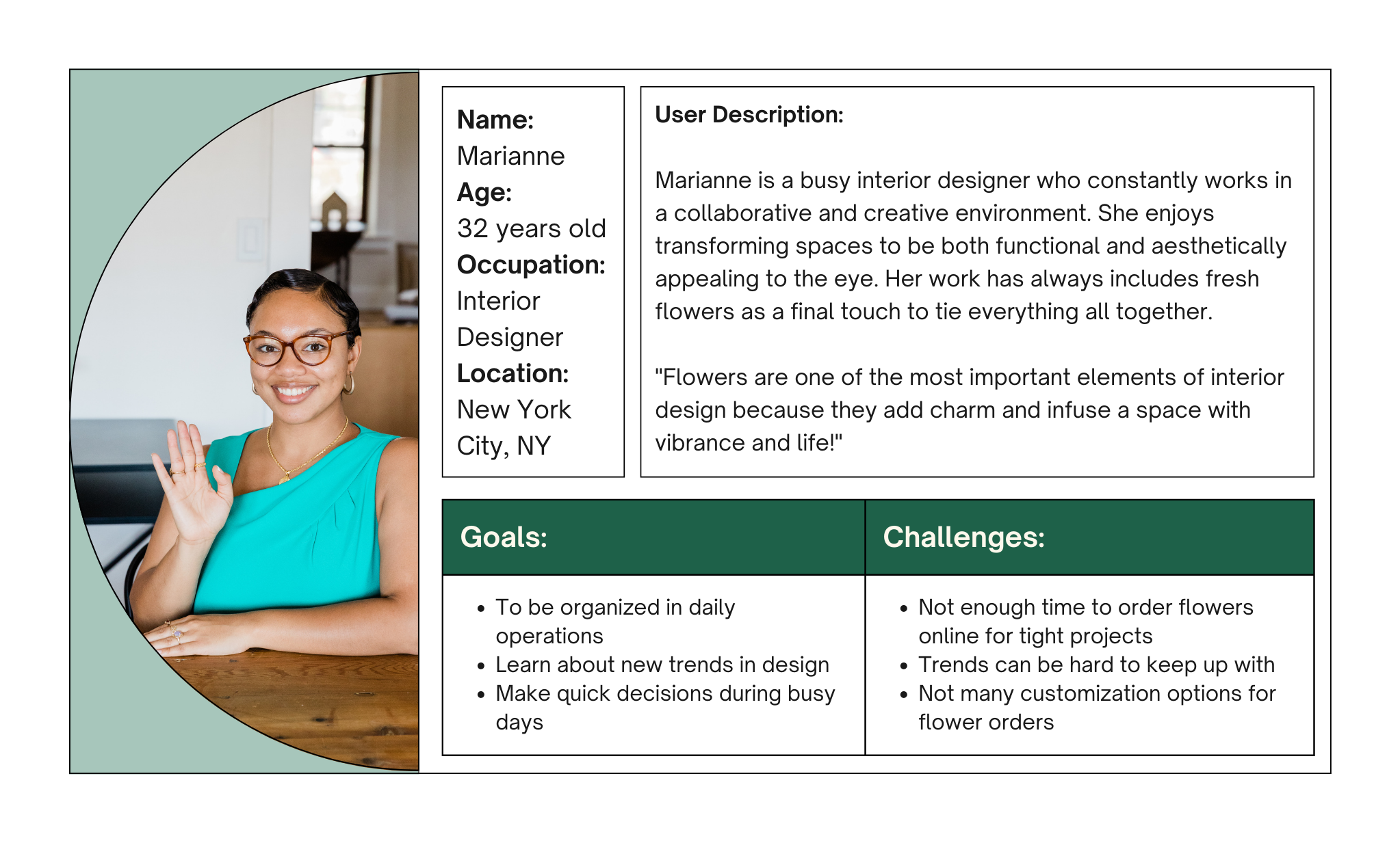 Marianne is a busy, working adult who needs a way to customize flower arrangements and conveniently place orders because she can feel stressed and overwhelmed by various flower selections.